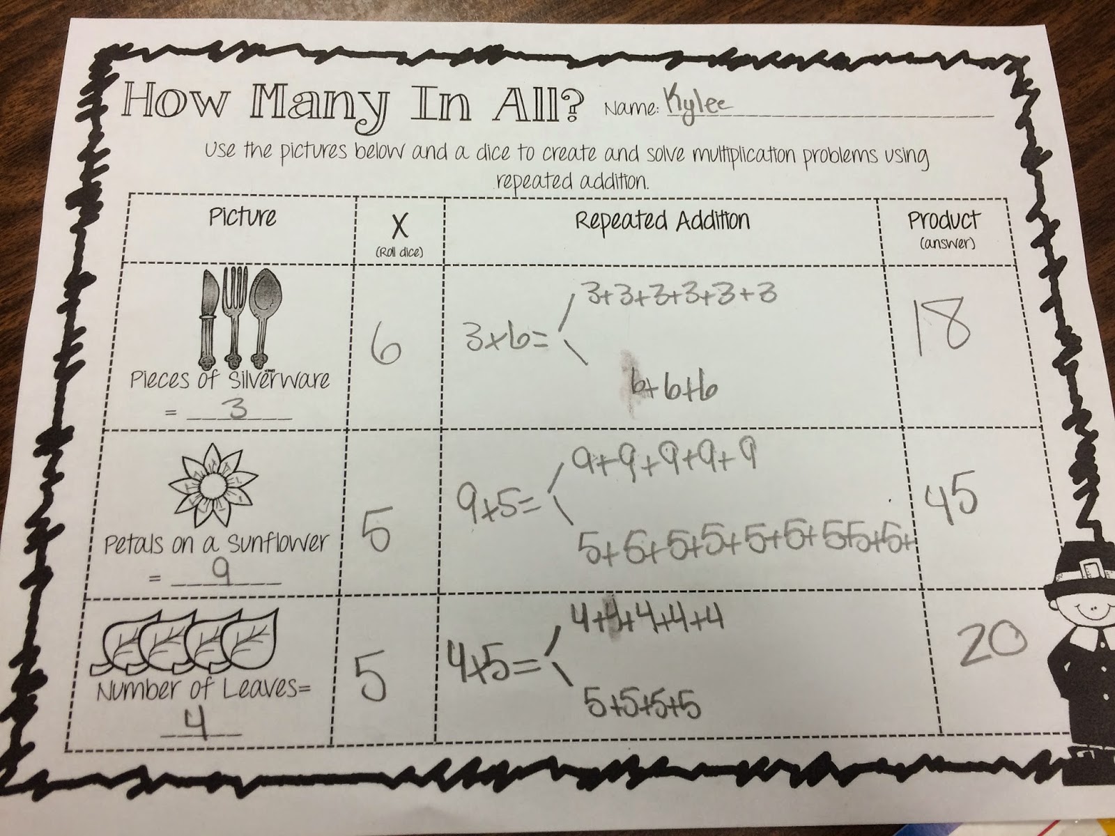 For this activity, we created multiplication problems by using fun Thanksgiving illustrations and dice. We practiced writing both ways to write the addition number sentence and of course, found the product! Then we ended the lesson by playing a fun Turkey Trot partner game!